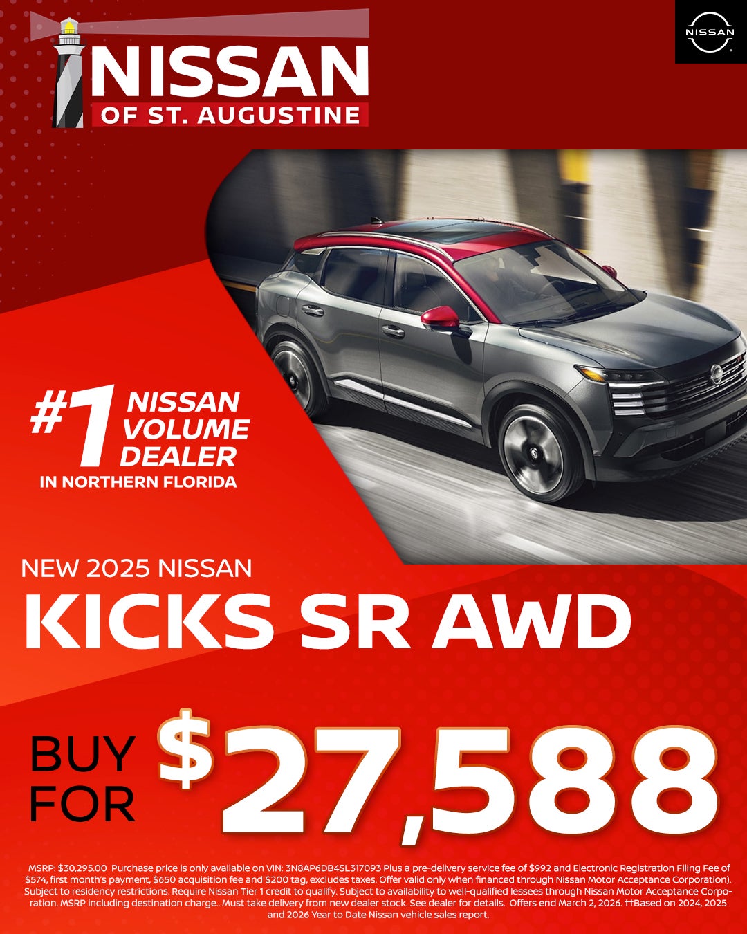 All pricing is for in-stock units only. All new vehicle pricing includes $1,500.00 financing credit through dealers preferred lender. Residency Restrictions apply. Special APR offers are for well qualified buyers with Tier 1 approval through NMAC. Offers are not combinable with any other offers or purchase programs. Must Finance with dealers Preferred lender (Non Special APR.) We strive to make sure all pricing and incentives are correct however errors do occur and we are not responsible for any errors that may be displayed on our site or any 3rd party site. Please contact dealer for complete offer details and any other questions. Pricing DOES NOT include: $992 Dealer Services Fee , Tax, Title, $574 E-File Fee, Registration, or $695 Lease Acquisition fee (if applicable.) Incentives and special APR available are only for the date shown and are subject to change at anytime without notice. Offer expires at month end, please see dealer for details. "Prices and payments may not include an optional $1,598 Nissan of St. Augustine Advantage Package.