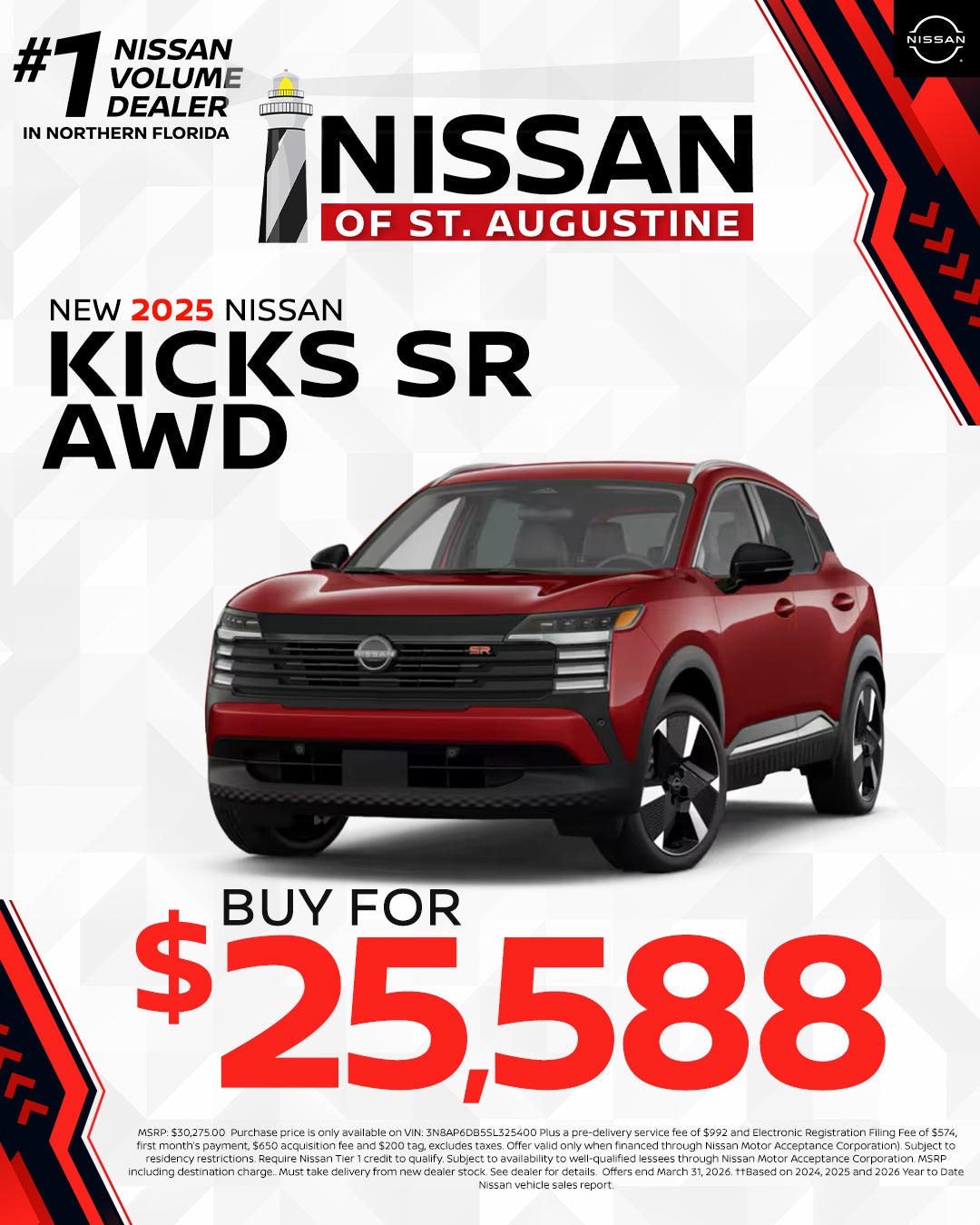 All pricing is for in-stock units only. All new vehicle pricing includes $1,500.00 financing credit through dealers preferred lender. Residency Restrictions apply. Special APR offers are for well qualified buyers with Tier 1 approval through NMAC. Offers are not combinable with any other offers or purchase programs. Must Finance with dealers Preferred lender (Non Special APR.) We strive to make sure all pricing and incentives are correct however errors do occur and we are not responsible for any errors that may be displayed on our site or any 3rd party site. Please contact dealer for complete offer details and any other questions. Pricing DOES NOT include: $992 Dealer Services Fee , Tax, Title, $574 E-File Fee, Registration, or $695 Lease Acquisition fee (if applicable.) Incentives and special APR available are only for the date shown and are subject to change at anytime without notice. Offer expires at month end, please see dealer for details. "Prices and payments may not include an optional $1,598 Nissan of St. Augustine Advantage Package.