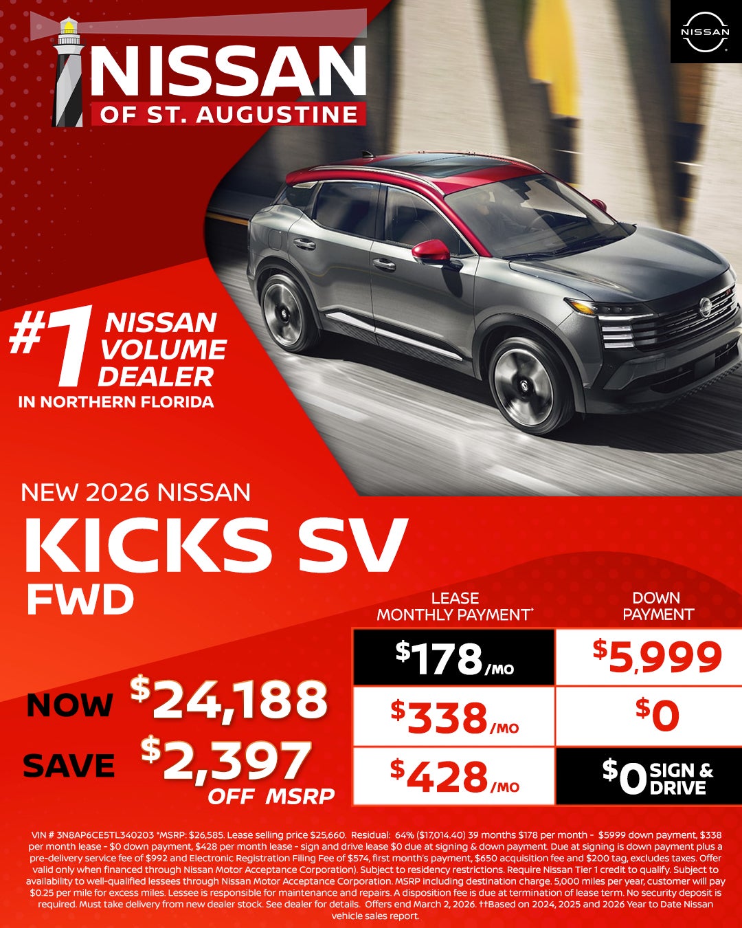 All pricing is for in-stock units only. All new vehicle pricing includes $1,500.00 financing credit through dealers preferred lender. Residency Restrictions apply. Special APR offers are for well qualified buyers with Tier 1 approval through NMAC. Offers are not combinable with any other offers or purchase programs. Must Finance with dealers Preferred lender (Non Special APR.) We strive to make sure all pricing and incentives are correct however errors do occur and we are not responsible for any errors that may be displayed on our site or any 3rd party site. Please contact dealer for complete offer details and any other questions. Pricing DOES NOT include: $992 Dealer Services Fee , Tax, Title, $574 E-File Fee, Registration, or $695 Lease Acquisition fee (if applicable.) Incentives and special APR available are only for the date shown and are subject to change at anytime without notice. Offer expires at month end, please see dealer for details. "Prices and payments may not include an optional $1,598 Nissan of St. Augustine Advantage Package.