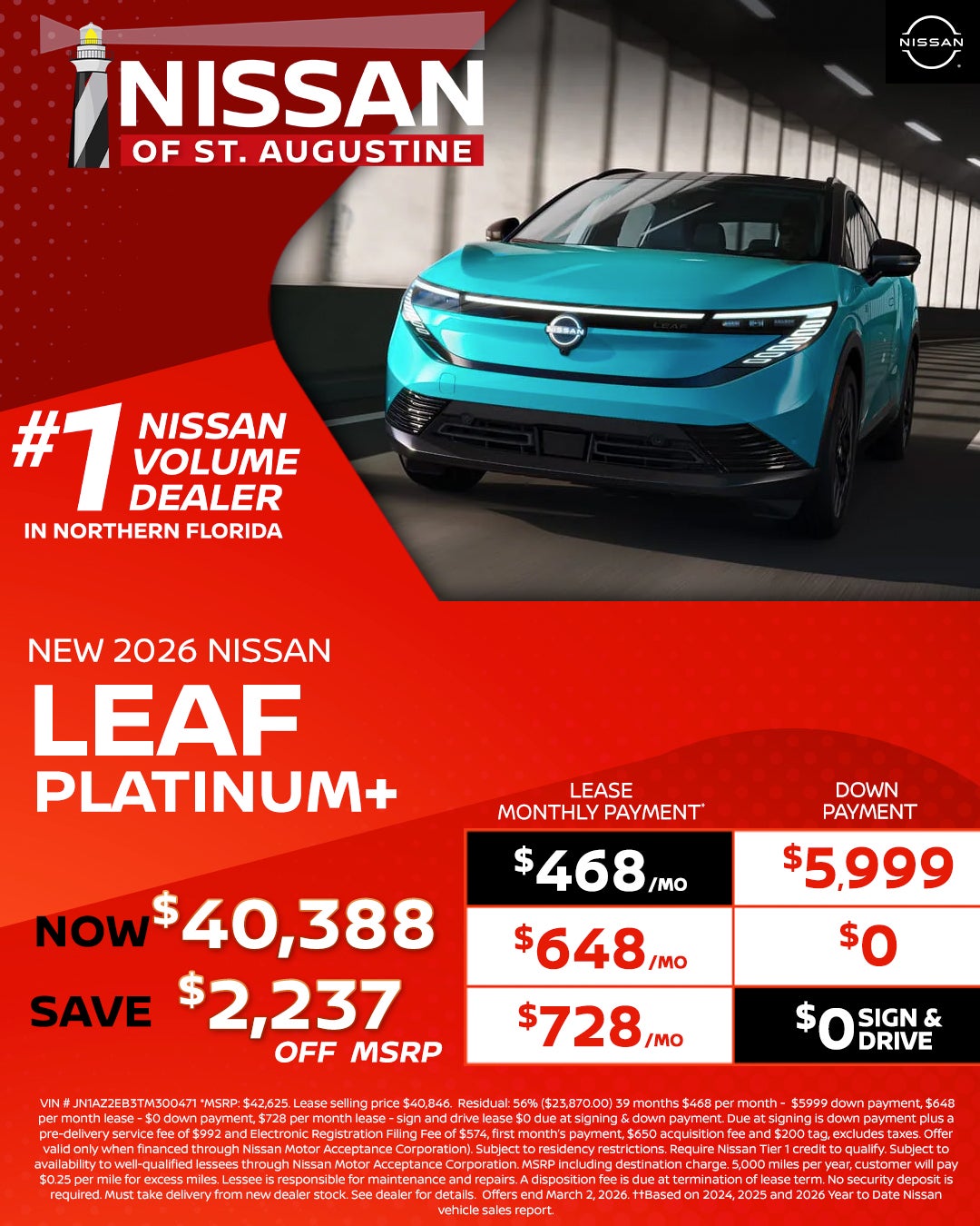 All pricing is for in-stock units only. All new vehicle pricing includes $1,500.00 financing credit through dealers preferred lender. Residency Restrictions apply. Special APR offers are for well qualified buyers with Tier 1 approval through NMAC. Offers are not combinable with any other offers or purchase programs. Must Finance with dealers Preferred lender (Non Special APR.) We strive to make sure all pricing and incentives are correct however errors do occur and we are not responsible for any errors that may be displayed on our site or any 3rd party site. Please contact dealer for complete offer details and any other questions. Pricing DOES NOT include: $992 Dealer Services Fee , Tax, Title, $574 E-File Fee, Registration, or $695 Lease Acquisition fee (if applicable.) Incentives and special APR available are only for the date shown and are subject to change at anytime without notice. Offer expires at month end, please see dealer for details. "Prices and payments may not include an optional $1,598 Nissan of St. Augustine Advantage Package.