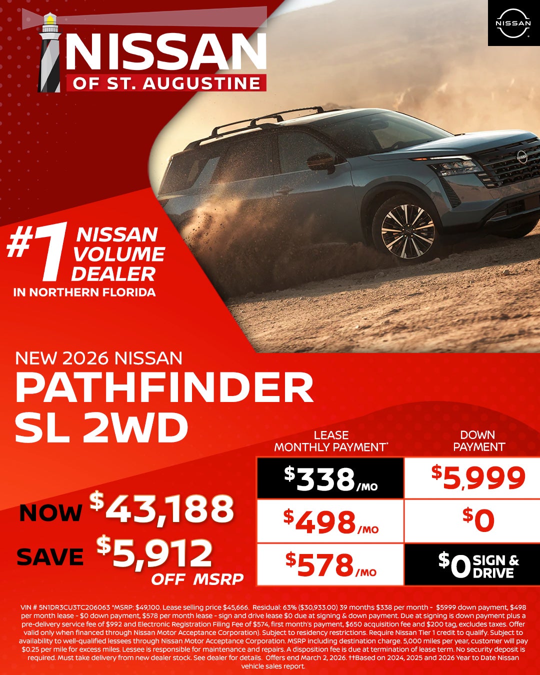 All pricing is for in-stock units only. All new vehicle pricing includes $1,500.00 financing credit through dealers preferred lender. Residency Restrictions apply. Special APR offers are for well qualified buyers with Tier 1 approval through NMAC. Offers are not combinable with any other offers or purchase programs. Must Finance with dealers Preferred lender (Non Special APR.) We strive to make sure all pricing and incentives are correct however errors do occur and we are not responsible for any errors that may be displayed on our site or any 3rd party site. Please contact dealer for complete offer details and any other questions. Pricing DOES NOT include: $992 Dealer Services Fee , Tax, Title, $574 E-File Fee, Registration, or $695 Lease Acquisition fee (if applicable.) Incentives and special APR available are only for the date shown and are subject to change at anytime without notice. Offer expires at month end, please see dealer for details. "Prices and payments may not include an optional $1,598 Nissan of St. Augustine Advantage Package.