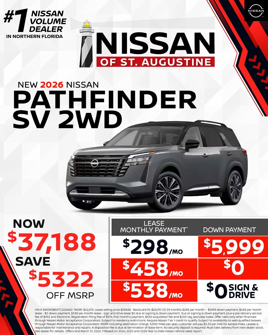 All pricing is for in-stock units only. All new vehicle pricing includes $1,500.00 financing credit through dealers preferred lender. Residency Restrictions apply. Special APR offers are for well qualified buyers with Tier 1 approval through NMAC. Offers are not combinable with any other offers or purchase programs. Must Finance with dealers Preferred lender (Non Special APR.) We strive to make sure all pricing and incentives are correct however errors do occur and we are not responsible for any errors that may be displayed on our site or any 3rd party site. Please contact dealer for complete offer details and any other questions. Pricing DOES NOT include: $992 Dealer Services Fee , Tax, Title, $574 E-File Fee, Registration, or $695 Lease Acquisition fee (if applicable.) Incentives and special APR available are only for the date shown and are subject to change at anytime without notice. Offer expires at month end, please see dealer for details. "Prices and payments may not include an optional $1,598 Nissan of St. Augustine Advantage Package.